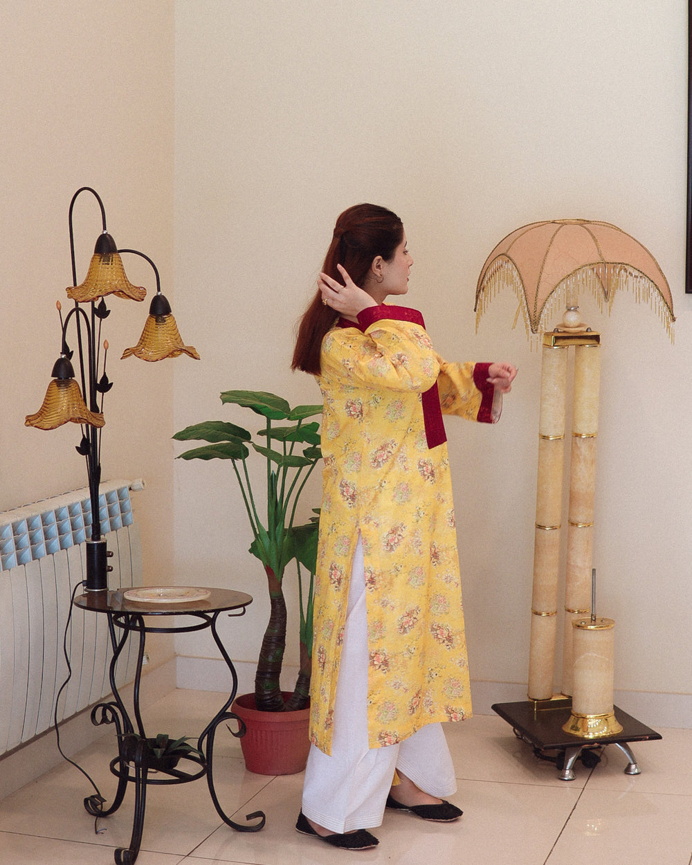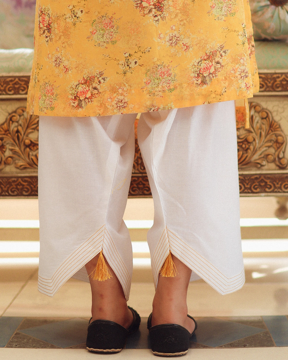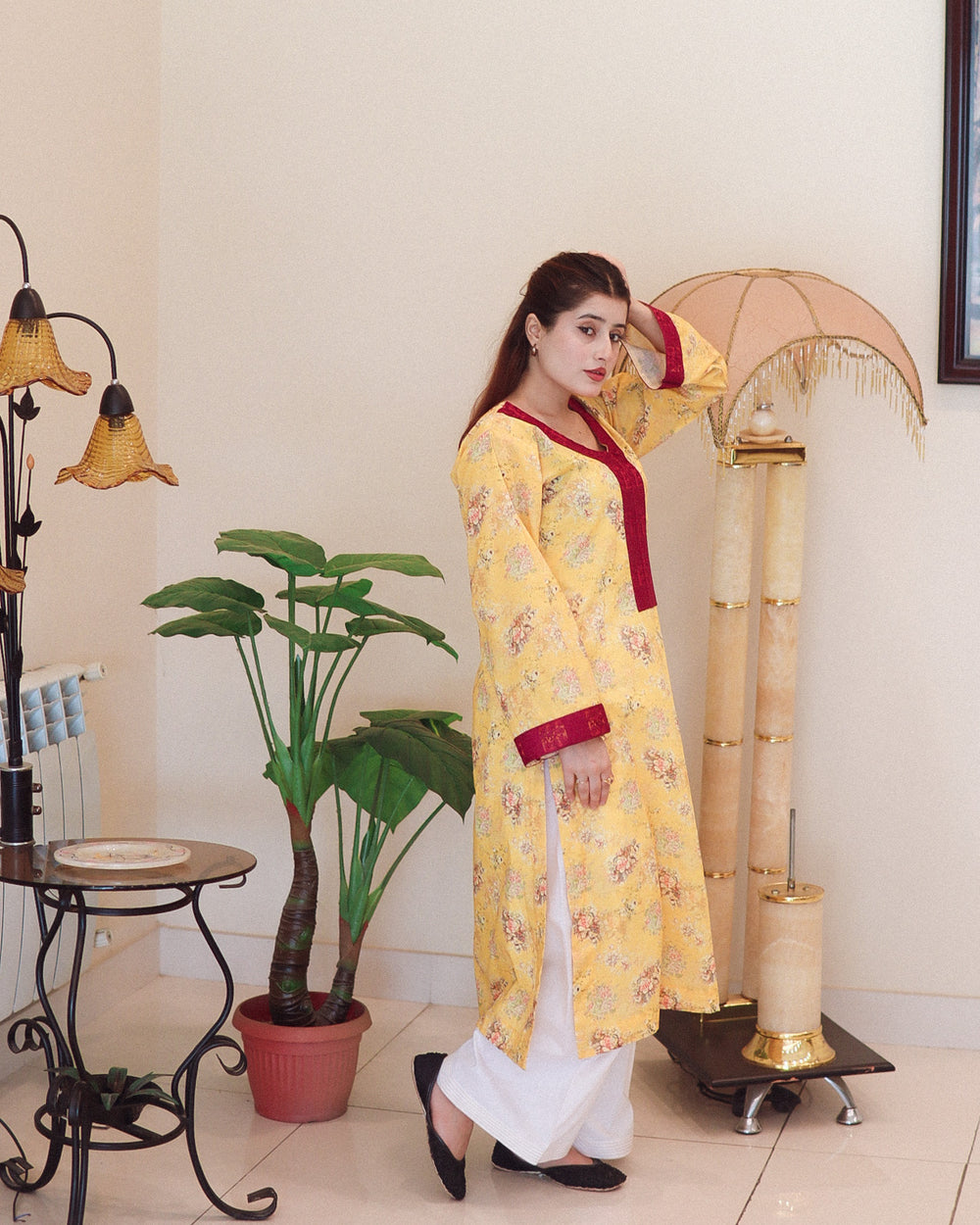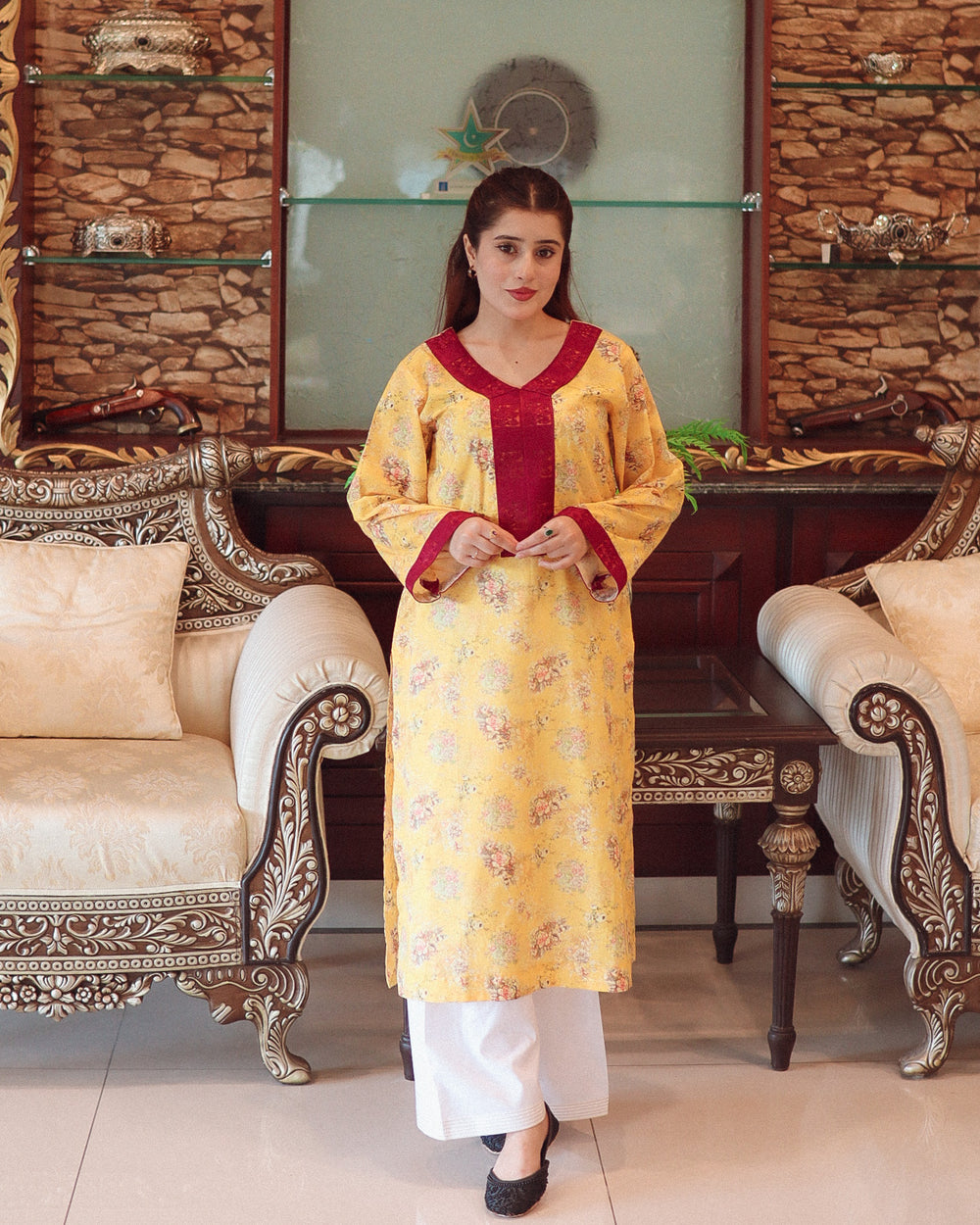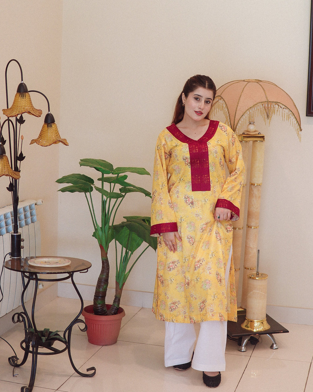 The straight-cut kurta features side slits for ease and comfort. The bright yellow base is enhanced with a subtle floral print in soft shades, creating a balanced and elegant look. A deep V-neckline adorned with a dark maroon patch adds a bold contrast, complemented by matching maroon cuffs. The full-length sleeves with maroon borders complete the design beautifully. Paired with plain white straight-cut trousers, this outfit offers a clean and well-balanced silhouette.
