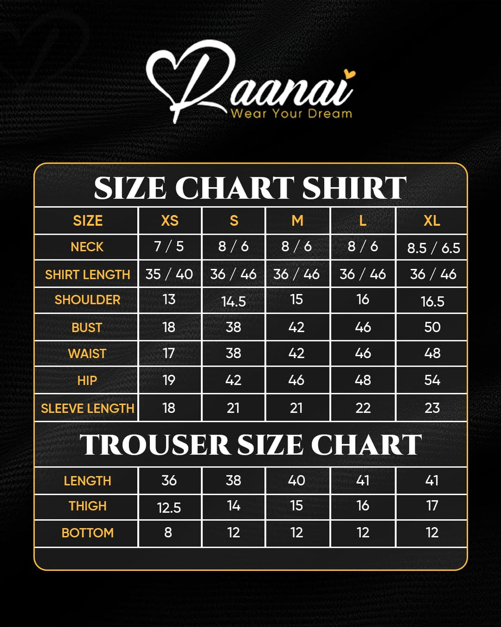 | Trouser Length | 36 | 38 | 40 | 41 | 41 |